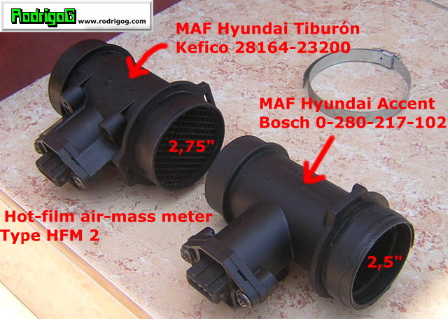 El flujómetro original de Accent es Bosch 0-280-217-102 de rango de 10 a 350 kg/h, se reemplazó para prueba por un Kefico 28164-23200, rango 10 a 480 kg/h que es usado en los Hyundai Tiburón 2000.
