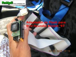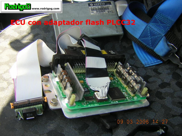 Las primeras pruebas en la ECU las hice mediante un adaptador de pines PLCC32 del 27C512 a una memoria Flash 49F010 (128KB), con una cable plano de disquetera saqué el chip por fuera de la ECU para no sacarla a cada rato... La memoria flash se puede grabar y borrar las veces que quieras, en cambio la eprom se graba una sola vez.