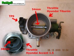 - Accent 1.6 dohc 16v: Entrada 55 mm, mariposa 49 mm, salida 55 mm.